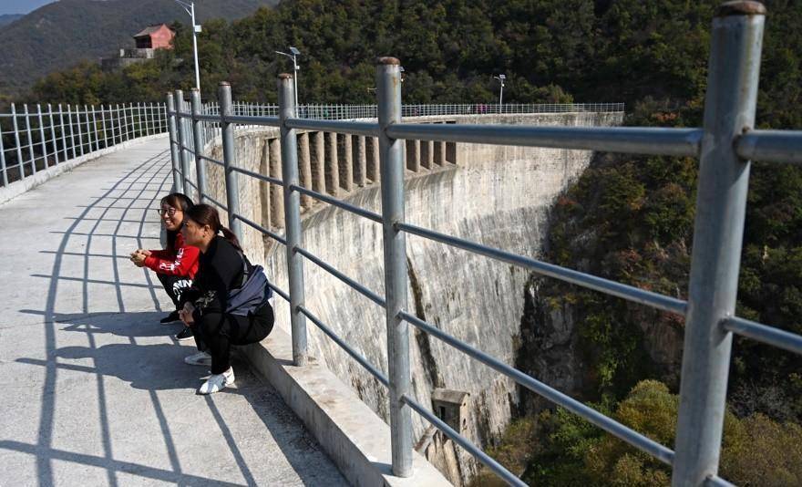前人栽树,后人乘凉。大河庙水库不仅解决了当地老百姓的现实问题,无意中还开辟出一方引人入胜的自然景观。因为水库灌区距离周边市区只有一两个小时车程,加上空气清新,风景宜人,喜欢户外希望亲近大自然的人,都乐于利用闲暇时光来这里活动活动筋骨,感受一下偷得浮生半日闲的轻松愉悦。图为两名户外登山爱好者在大坝上休息,远处红色的小房子是山上的大河庙。