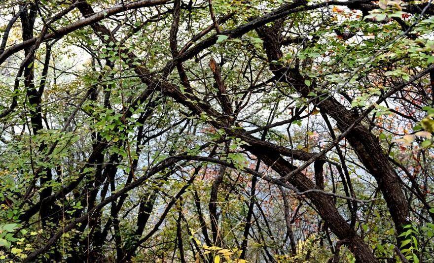 大河庙景区内植被茂密,笔者叫得上名字的有山栗子、山葡萄等野生植物,还有更多数不胜数的植物种类。因为山深林密,这里更是野鸡、野兔等多种野生动物的家园。图为被秋色染黄的灌木树叶。