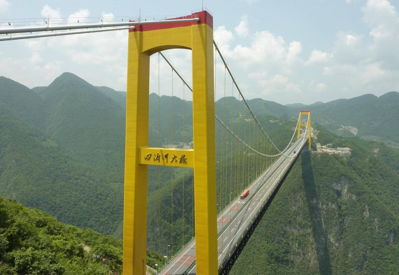 四渡河大桥是目前我国深山峡谷中的最大跨度悬索桥,也是世界上首座跨度达900米以上的山区特大悬索桥,北盘江大桥比它晚7年建成。目前,四渡河大桥是世界第二高悬索桥,第一高悬索桥是北盘江大桥,距离谷底565米。