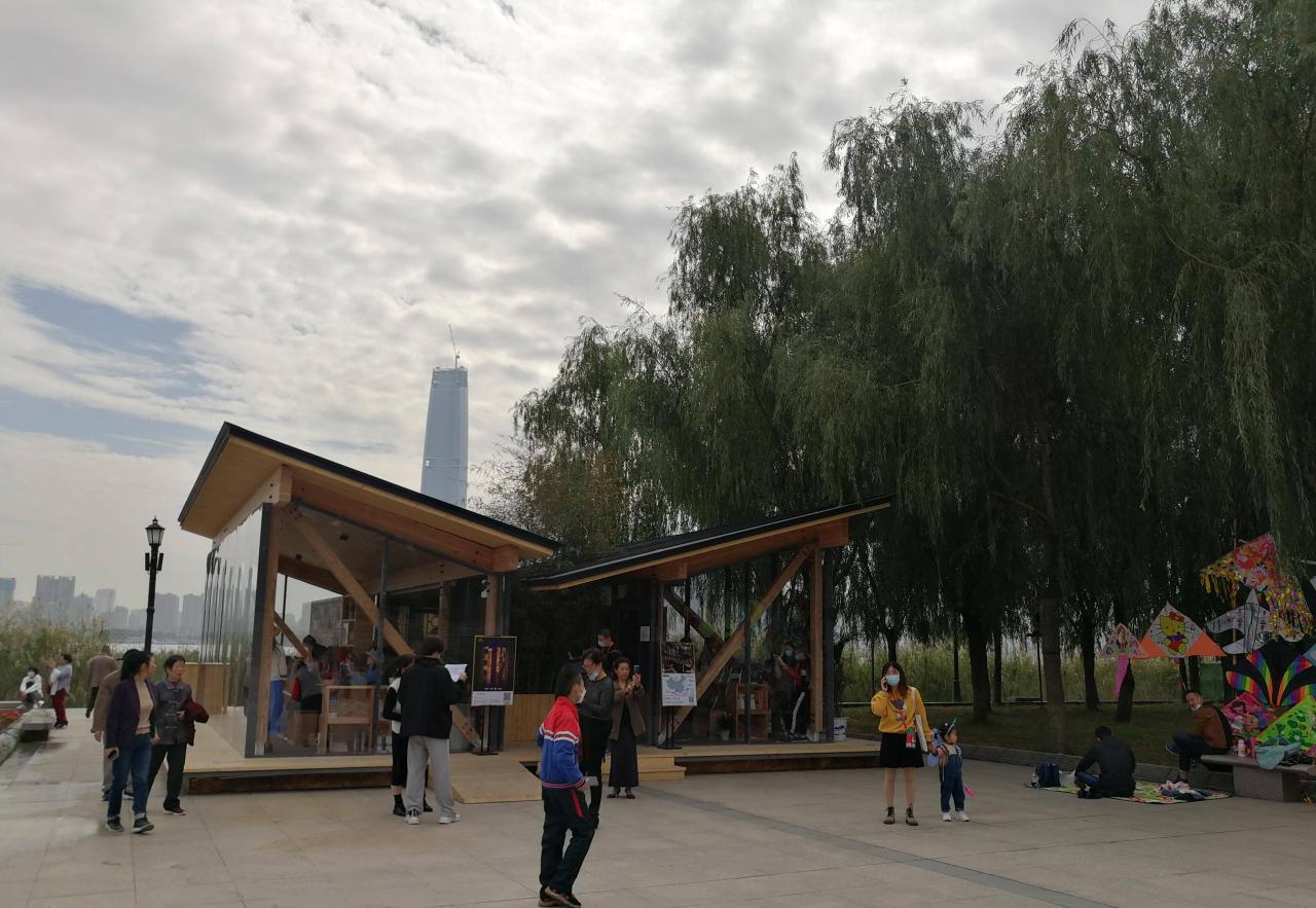 可能好奇的朋友就会问了,这个地方到底是在武汉哪里呢?那里又有着哪些不一样的风景呢?带着这些疑问和好奇,今天就和大家一起来聊聊,有关汉口江滩朗读亭的那些事。首先,大家现在看到的这座位于汉口江滩附近的木质玻璃建筑,就是它的主体建筑。