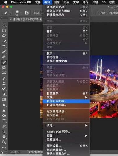 由于二张图片的焦段不一样,我们要执行以下“图层对齐”。把二张图层全选,然后编-自动对齐图层。点击,选择第一个“自动”“