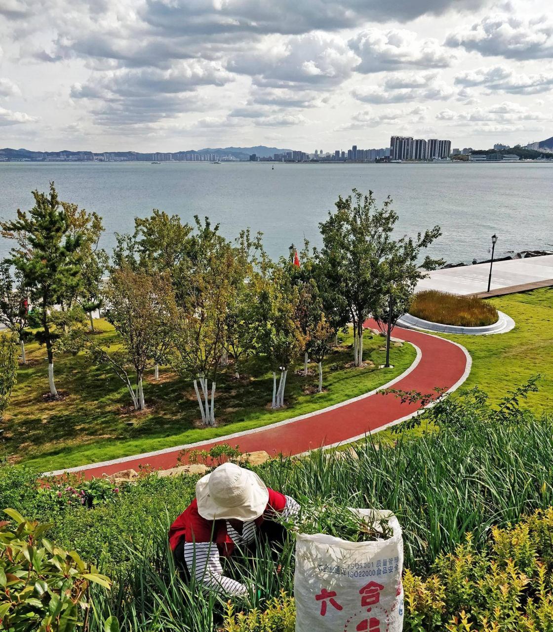 这个令我惊喜的小角落就在东山宾馆东边,紧挨着大海,在一个高耸的山丘上,有花团锦簇,有红色新铺的步道,有观景台,有运动场,可以静坐看脚下大海,看对面像个巨型帽子一样的刘公岛,还有渔船摇曳。