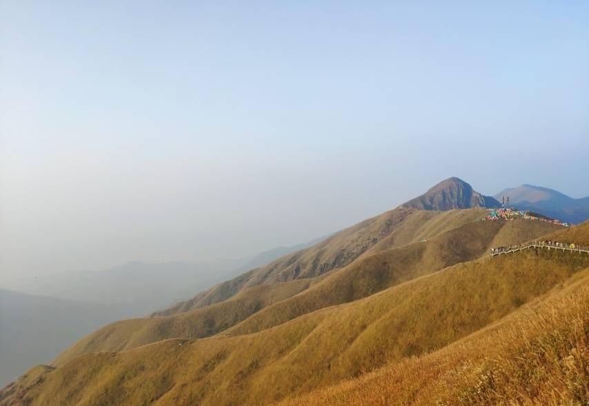 我和小伙伴坐在草地上,看着慢慢升起的太阳,虽然有些遗憾,但也不会影响我们对这趟旅程的喜爱。我们选择了从另一边全程徒步下山,我现在想想这个决定,真的是个错误,因为第二天我的腿就废了,疼到不能自理。武功山山顶上开阔的一片草地是我喜欢的,黄油油的一片,一望无际的感觉。
