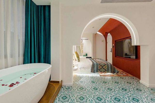 与此同时TA浓浓的异域风情,很适合亲子度假,小楼内共有套房八款,特别是TA家亲子房,小朋友喜欢的元素这里全都有;室外是地道的中国古城,室内是阿拉伯风格,如身临其境般,仿佛穿梭在时空中。