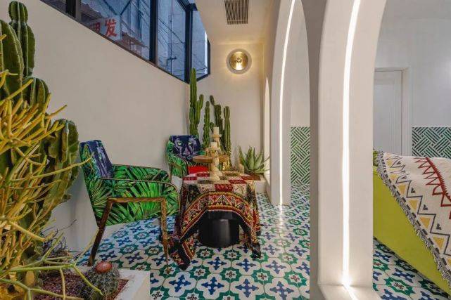 走进巷里,每一个角落都像被精心布置过的,哪哪都能出大片!小楼内装修风格突出,入门即是浅水游鱼池。往里走便是休息区,脚下是绿白相撞的彩色琉璃石砖,尖顶穹窿的艺术装修造型让人仿若隔世,瞬间踏入摩洛哥民居生活。