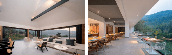 优秀的建筑设计和室内设计让每一个地方都适合坐着,不管是看景观还是玩手机,坐下就可以忘记时间, 因为植被种类的丰茂,山色层次多变,来此的宾客在餐厅吃完饭,都要看着山多坐一会儿,舍不得起身。