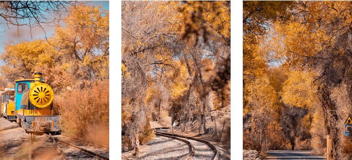 秋日的塔里木胡杨林公园,大片的胡杨,在时光的轮回中,悄悄换了金黄,将单调的沙漠装点得像童话世界般美丽。沿着小铁路往胡杨深处走,你会发现,在湛蓝天空下的胡杨,在阳光的照射下金黄的颜色更加耀眼。满是岁月痕迹的胡杨和小铁路,共同组成一幅五彩斑斓的油画。
