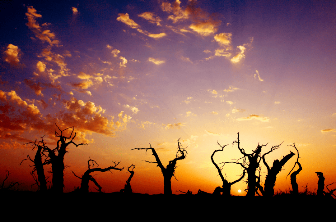 这里的胡杨曾枝繁叶茂,但由于近代人们的不合理开发,导致河流断流等一系列的环境破坏,这里的胡杨树成片枯萎死亡。
