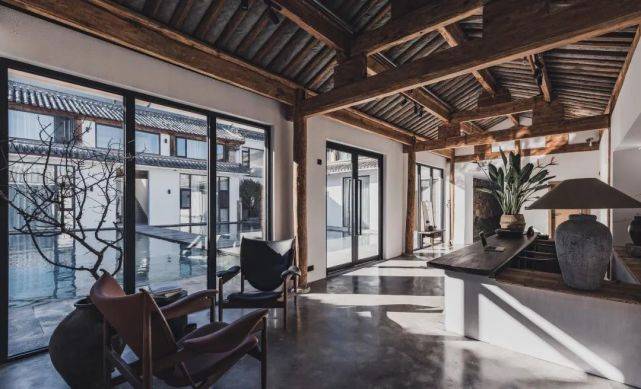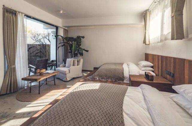 民宿仅有十三间房,共有3个老房子,他家屋顶的瓦片都是主人自己烧制的,民宿院心是一汪水,映着天空,照着自己。这里每个房间都有个大露台,或是小庭院,无论是在房间里还是在房间外,都很从容,每个房间都是个小家。