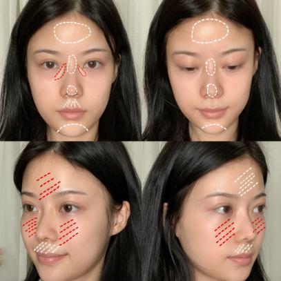 在画高光的时候我们要先知道自己的高光适合打在哪里,这也是许多女生不清楚的地方,所以才会跟着美妆博主们画。我们可以正面放个光源,然后看镜子或者把脸拍下来,找到自己脸上的反光点。如果是找不到自己反光点的话,可以在涂完乳液面霜的时候看,那时候脸上反光的地方更明显一些。
