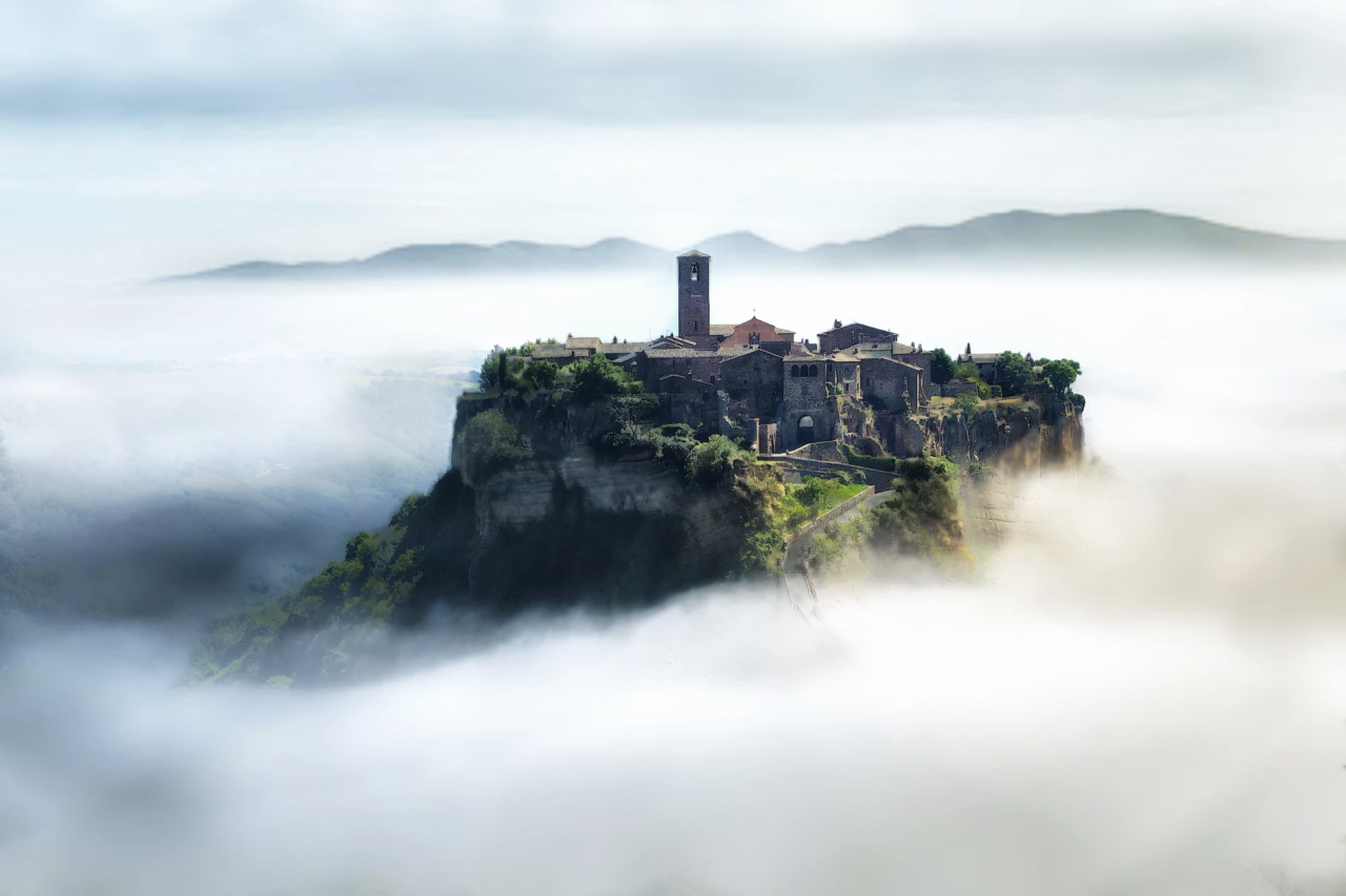 小城建于火山凝灰岩顶上。这些由火山喷出地表后冷却堆积固结的火山灰,外貌粗糙,疏松多孔,脆弱不堪。由于风侵雨蚀,古城悬崖周边的岩石不断脱落,古城也开始沉降。1695年,古城遭受了第一场大地震,房屋道路被摧毁。此后,陆续的地震、山体滑坡、世界大战,天灾人祸不断摧残它本已脆弱的躯体。1854年以来,古城整体地基已下降了25英尺,目前仍以每年几厘米的高度沉降着。人们迫不得已搬离古城,生怕某天一觉醒来,房子便不知所踪。维基百科说,此地土生土长的圣人Saint Bonaventure,他儿时的居所,就已跌落悬崖,踪迹全无。现在,它却以“天空之城”的绰号让我们熟知,因为传言宫崎骏曾来到此地,见到古城被云雾所吞噬,宛如无根之城。后来以此为灵感,便有了你我熟知的《天空之城》。