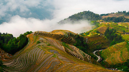 龙脊梯田之所以名闻遐迩,就在于它那恢宏磅礴的气势。南国属丘陵地带,山区有梯田不足为奇,但像龙脊梯田如此大规模集中的实属罕见。其规模磅礴壮观,气势恢弘,如链似带,从山脚盘绕到山顶,小山如螺,大山似塔,层层叠叠,高低错落。那抽象的曲线,更胜梵高笔下的星空,如行云流水般,潇洒柔畅,妩媚动人。