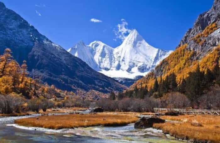 六、四姑娘山,由长年冰雪覆盖的四座山峰组成,犹如头披白纱,姿容俊俏的四位少女。