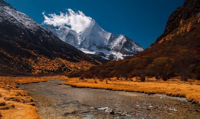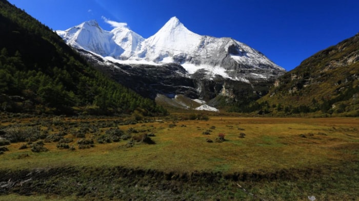 这个时候,我们面前会有两条线路选择一条短线,一条长线,我们先来说说短浅,从扎灌崩到冲古寺到珍珠海,从扎灌崩下车前行600米就可以看到冲古寺,冲古寺意为湖泊源头的寺庙,海拔3900米,位于仙乃日雪山脚下,始建于元朝,距今已经800年,离开冲古寺,我们继续徒步前往珍珠海,大概20分钟就可以到达。珍珠海海拔4100米,是亚丁海拔最低的圣湖,也是公认的拍摄三大神山之首,仙乃日倒影的最佳地点,仙乃日海拔6032米,是稻城县海拔最高的山峰,也是四川省第五大高峰。