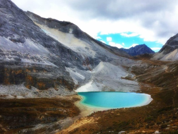 回头看到的是三神山的南峰,夏诺多吉,海拔5958米,夏诺多吉雪山的造型也是最接近金字塔的造型,下面一段是洛绒牛场到牛奶海,这一段是徒步路线,路程接近五公里,全程上坡,全程最累的也当属这段。很多地方都是土路,非常难走。来回上下需要花费五六个小时,这里要注意这边的行程没有售卖店,一定要把雨衣鞋套带上和氧气瓶,穿保暖衣服,自备干粮在路上吃,牛场旁边有个马帮驿站,体力不好的可以去骑马,价格是300元,可以骑到离牛奶海1.8公里的地方,但是只有30匹马,要早一点去,不然要排队,沿着山谷,一路攀升,我们将到达三大圣湖之首,牛奶海,他就这样子群山之间的一颗碧蓝宝石,神山近在咫尺,然而周围碎石遍布,有些荒凉,这时才明白为啥有人说去稻城亚丁时,身在地狱,眼在天堂,再徒步300米,就是全程的最高点,五色海,海拔4500米,作为当地人心中的圣湖,据说五色海能繁衍历史,预测未来,在阳光的照射下显得五光十色,有时又蓝得像地球的眼泪一样,去一次就能被震撼。