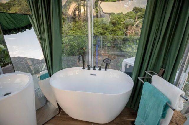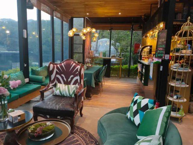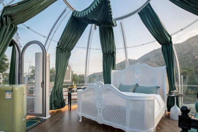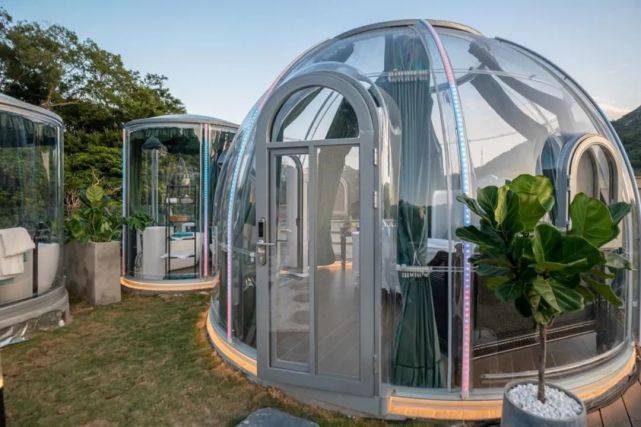 大厅内成片的墨绿色装饰、工业风的水泥地面、镂空的暖木色楼梯和硕大明亮的落地玻璃窗,入夜后民宿更是灯烛辉煌!民宿室外的两个圆形玻璃屋超出片,分别是餐厅屋和泡泡球玻璃