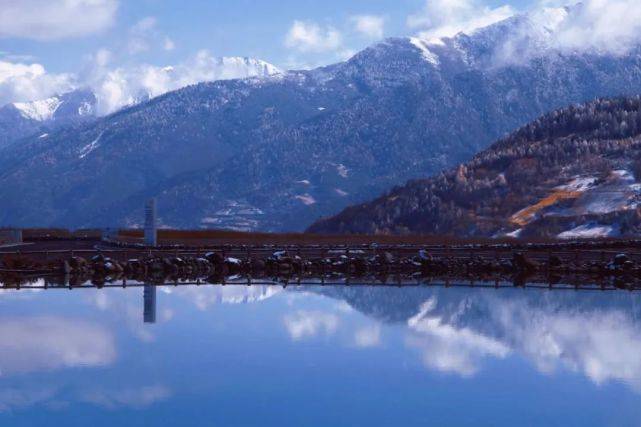 冲出一条湍急的河流,雪水在岩壁间激起沉闷的回响,在回响间依稀看得见柏树在阳光下的剪影