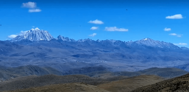 深冬海拔5820米的雅拉神山在阳光照耀下显得格外巍峨,抬头远望,山顶峰壁千仞,常年白雪皑皑,像披雪的直拱蓝天。