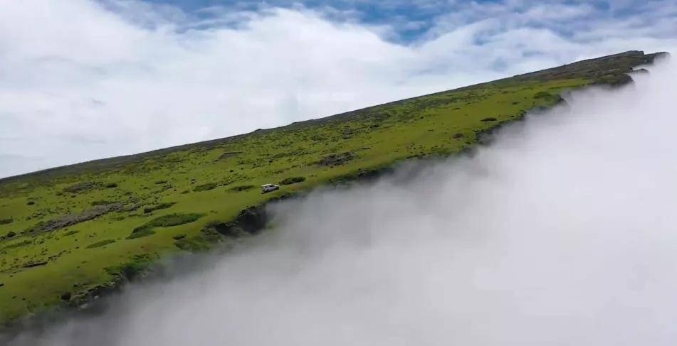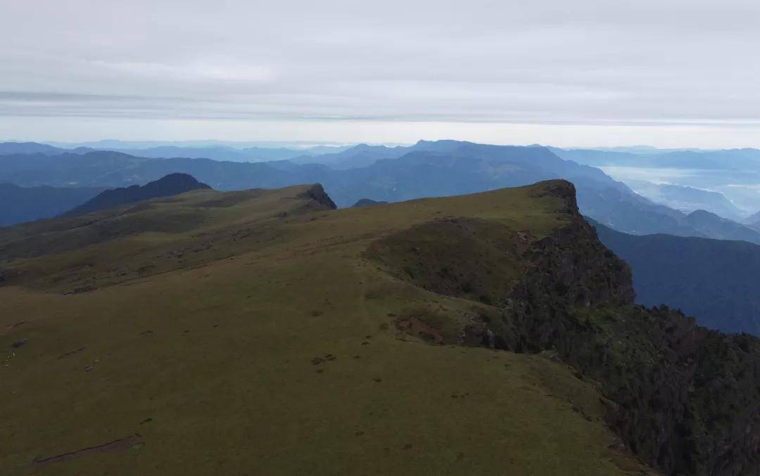 这里海拔达3600米,山顶平缓开阔,而西南侧沿着美姑河形成了一道绵延十公里的绝壁大断崖,落差在2000米左右,近乎于垂直在地面上,一边是青青草地,一边则是云海翻腾,这些是常见的断崖所没有的