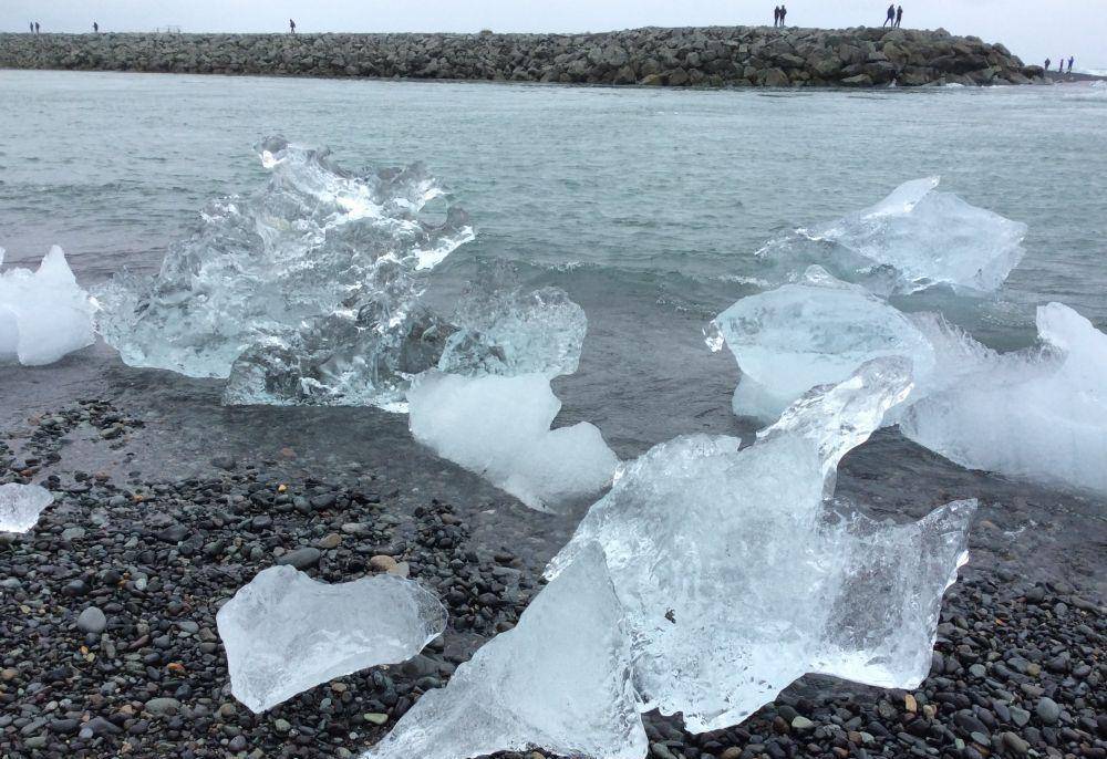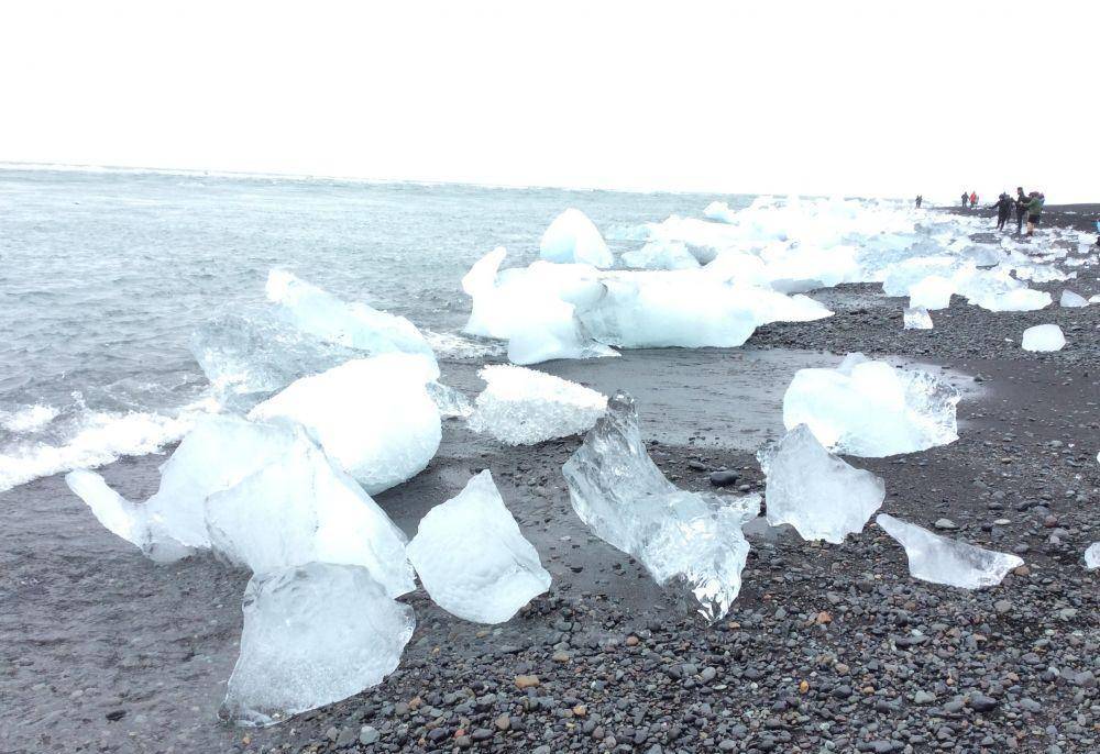 钻石黑沙滩,当然沙子是黑的,却不柔嫩细滑。而钻石,不是因为沙滩上遍布钻石,而是因为这个地方连接着冰河湖和入海口,冰河湖里的浮冰被海浪推送到沙滩上,散散落落,晶莹剔透,远远望去,似发亮的钻石,故名钻石黑沙滩。当走进细瞧,发现黝黑神秘的沙滩被半透明的冰块轻轻覆盖,每一个冰块都是不规则的立方体,内部是别样玲珑的世界。有的纹理清晰,有的纯洁如玉,有的白中透黑,绮丽多姿,生动有趣。那星星点点的晶莹,像跳跃的音符,和着大西洋海浪和杰古沙龙冰河湖冰湖水的低吟,在黑沙滩的黑色线谱上演奏着一曲优美的交响赞歌。