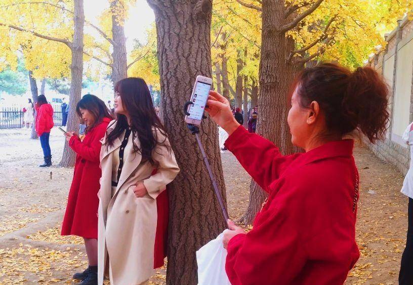 亮色衣装“抢眼”。在银杏林道游玩、拍摄,粉色、红色衣服最抢眼,到此一游的都是有备而来。一位大姐告诉我:“颜色鲜艳的衣服照的相很亮色,来了就多照几张,错过此时,得再等一年。”