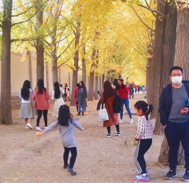 孩子闹得“最欢”。我去这里时正是孩子放学时分,不少孩子在家长带领下来银杏林道游玩,蹦蹦跳跳,一个个“闹”得真欢。