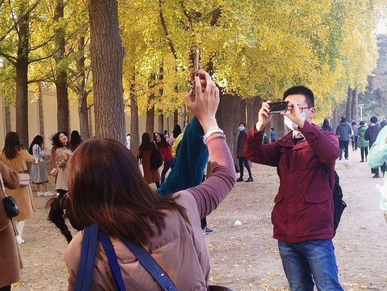 美女频频“出镜”。在银杏大道,有人在看银杏,也有人不时在悄悄“瞄”美女。