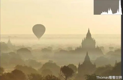 我们来看个例子。这是一张“正常曝光”的照片,像素主要是分布在直方图的中间,体现晨雾的朦胧: