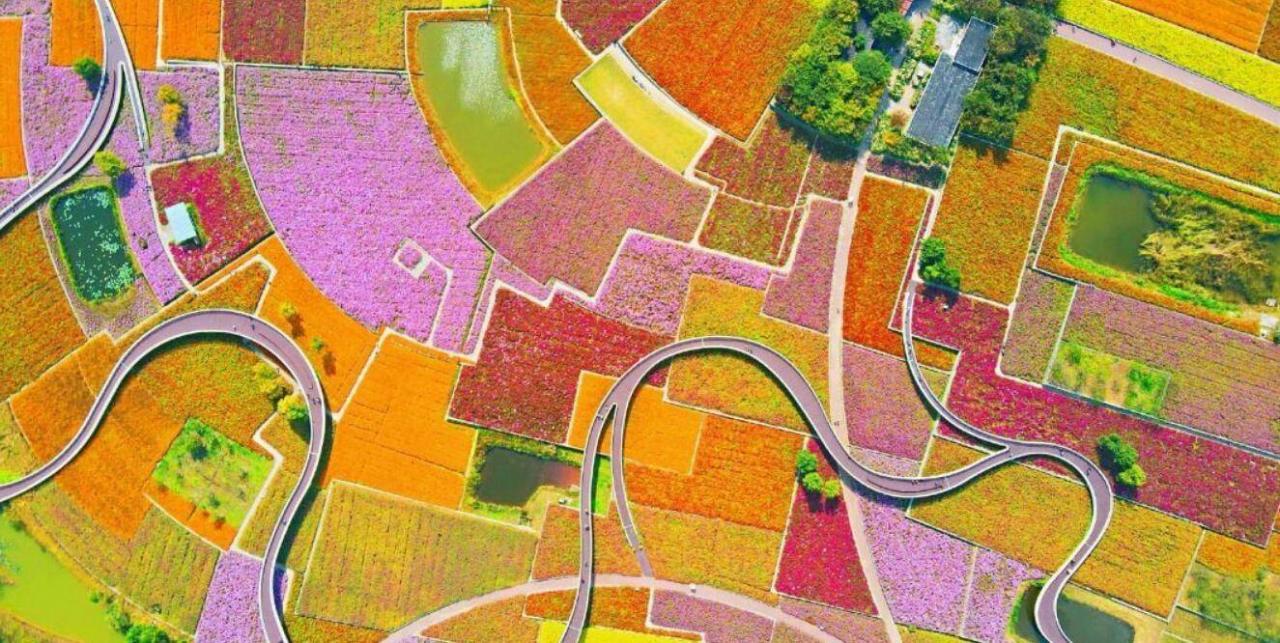 衲田花海鲜花绽放的时候,田地分成一块一块的,每一块种着不同颜色的花,红的、黄的、粉的、紫的花与蓝天白云相辉映,构成了一幅七彩的深秋画卷。