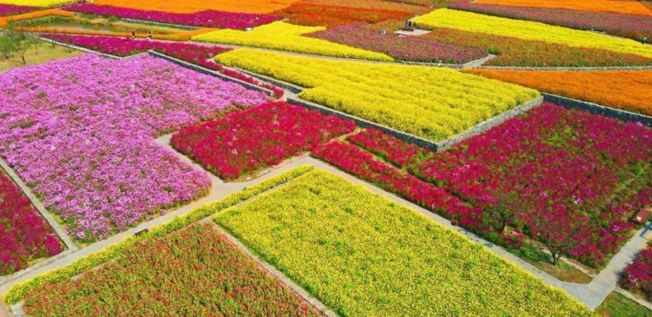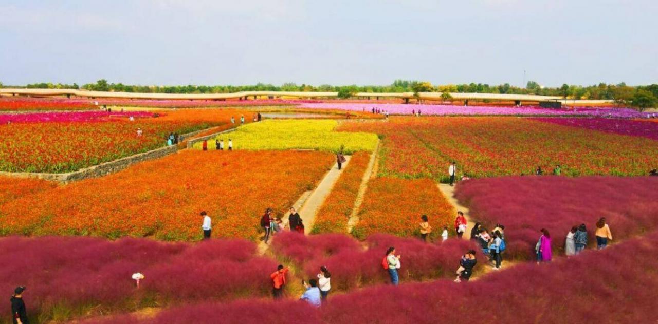 五彩斑斓的花海姹紫嫣红,非常美丽。各色花卉竞相绽放,硫华菊、百日草、醉蝶花、粉黛乱子草、马鞭草、波斯菊……红黄紫三大花区,只为等你来邂逅一场美丽的花事。