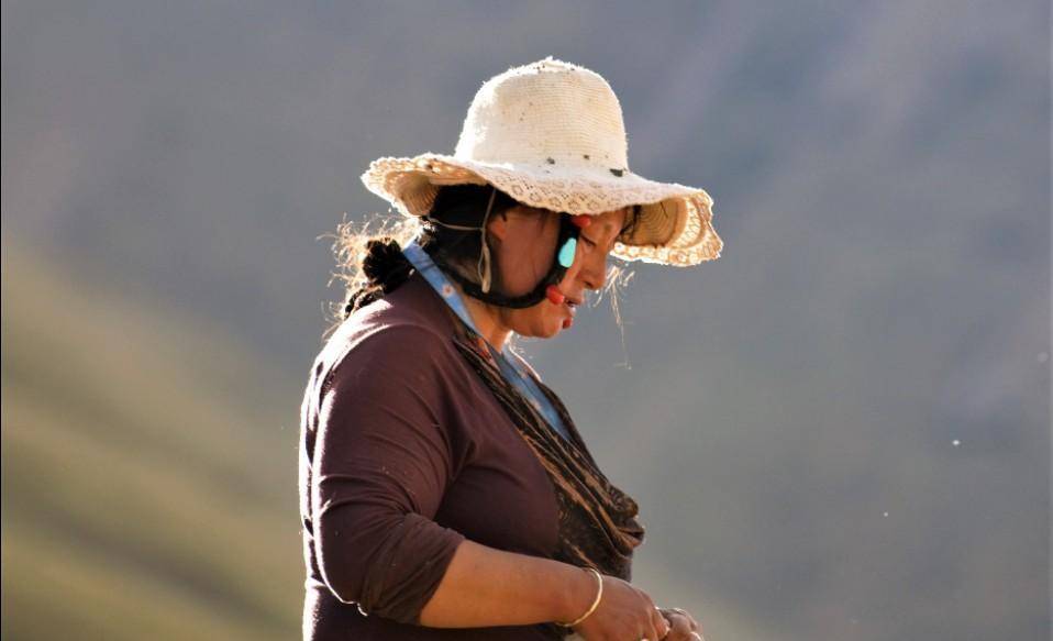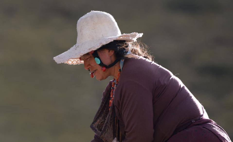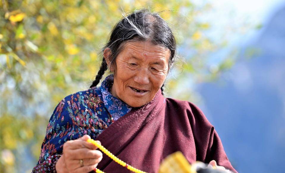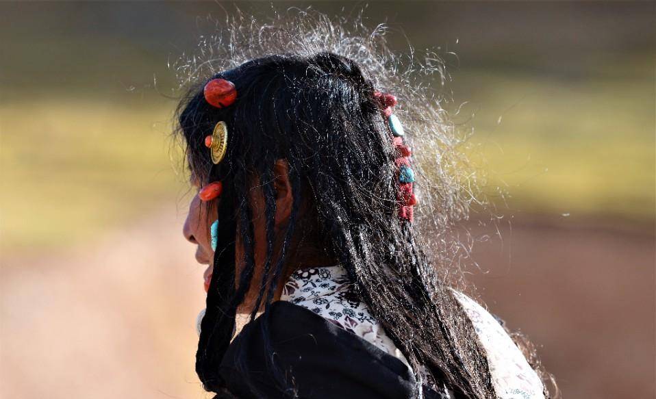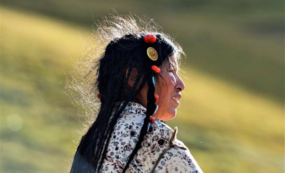 这位大妈的发饰辫子都非常特别,是藏民最经典的发型。