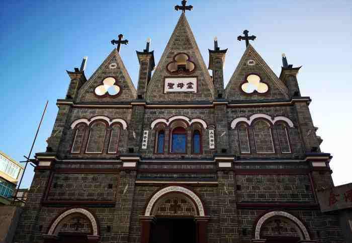来古城游玩千万不要着急,走着走着你会被一建筑吸引。高高的房屋弧形的门窗,尖尖的房顶上还立有十字架,在古城十分的抢眼。对,这是一所天主教堂。