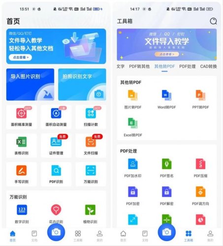 软件首页与工具箱界面展示着不同功能,有办公用的PDF转换、翻译工具、图片工具,还有生活中常用的万能识别、拍证件照、修复照片等功能,非常齐全!