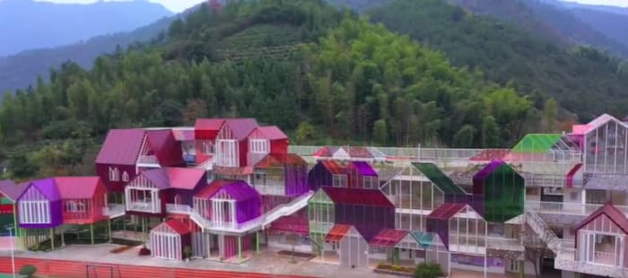第一站,富文乡中心小学。来到这里,一定要先去打卡这一座糖果色的城堡,在这个用玻璃建造的童话世界里,被称作史上最美的小学。在这里上学,真的是一件很开心的事情,真的太美了。随手一拍,妥妥的梦幻风网红照片。