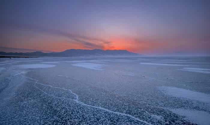 而我这次去的时间是2020年的12月23号,赶上赛里木湖开始结冰,整个赛里木湖呈现出一半水一半冰的状态,甚至还有路人问我为啥会一半水一半冰,以为是赛里木湖景区人为造出来的,其实也不难理解,我个人大概猜测一下,因为赛里木湖面积太大,达到了458平方公里,湖的深度又深浅不一,最深的地方可以达到90多米,而岸边的深度也就半米,整个湖的刨面图应该是一个家中炒菜用的圆底锅造型,最先结冰地方肯定是岸边水浅的地方,然后是靠近湖的北面部分的水开始结冰,因为整体靠北温度更低,最后才是温度相对较高南侧的湖水,而且因为整体水是从南向北运动,所以南侧的水呢更加活跃,活水也就更难结冰,个人的理解的也就到这了,至于对不对,希望有更权威的人来帮大家解谜,而且冬季赛里木湖除非遇到大雪天气封路,其余的时候都是铺装路,轿车跑起来也没有任何问题,而且被景区打扫得很干净。