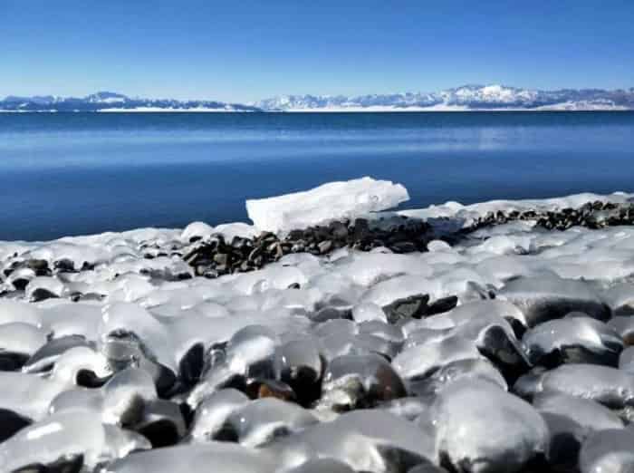 赛里木湖的水呢,透度又极高,你可以在岸边的水面上就可以看到水底被冻住的石头,也可以在上面来个滑行比赛,友情提示,湖面上极其滑溜,并且冻手冻脚,小脑不发达以及怕冷的朋友们一定要做好保暖措施,以及防滑措施,可以带那种简易的带钉子的防滑鞋套,也就几十块钱,还有来赛里木湖啊,一定记得备一些吃的或者肉之类的,如果你运气足够好,可以拍到狐狸。
