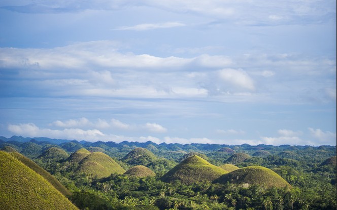 它们在雨季是绿色的,不过每到旱季,这些“干草堆”都会干枯,转为褐色,犹如一排排的巧克力排放在大地上,巧克力山这个名字由此而来。