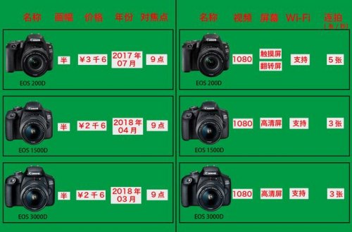 价格都在6000以内递减,这类型的机器性能没太大区别,但也绝对比手机摄影好。建议基本考虑资金购买即可,重点考虑800D和200D2这两款。选800D更接近专业级相机的操控,选200D2可以购入更新的机器,机器更小巧。