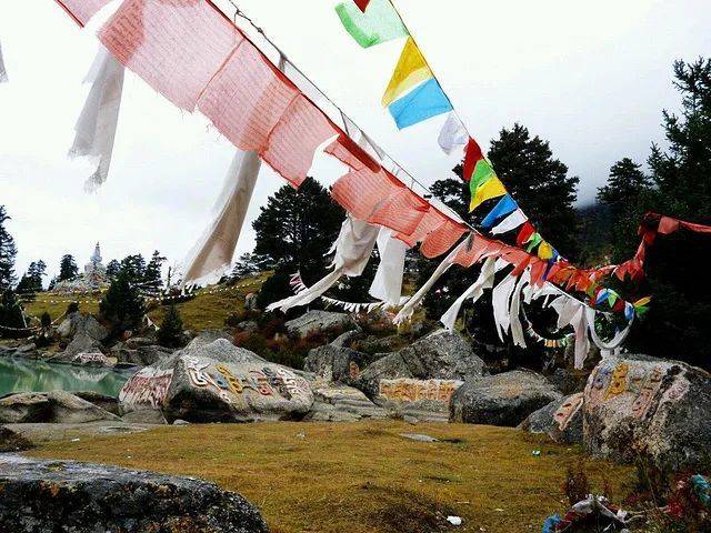 1、进入景区后,经过木桥,翻过一座小山坡就能看到一大片奶绿的湖面,可以沿着湖面慢慢游玩欣赏,累了以后可以坐在草甸上遥望雪山湖水,听着太阳能发电的诵经,让心灵得到休息