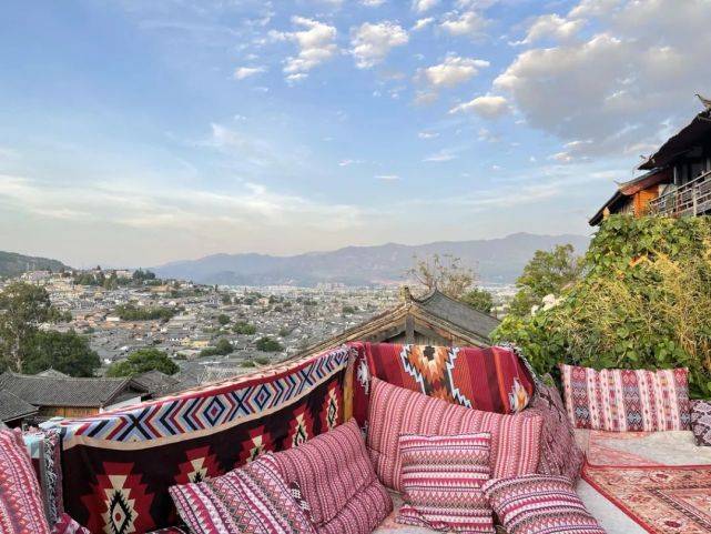 民宿融入本地人文建筑特色,走的是简约轻奢风,这里摩洛哥波西米亚原创观景台,夜晚观景平台风景很美丽,可以看到整个丽江古城夜景。