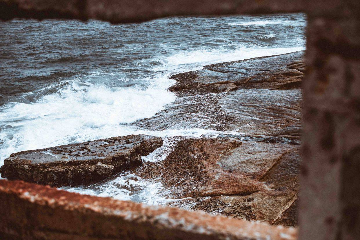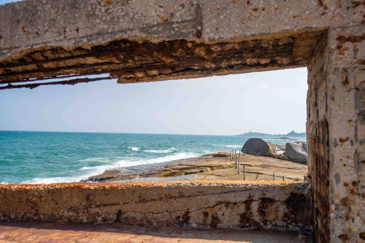 经过海边长时间的风吹日晒,古堡外面的墙壁出现了破损,斑驳,竟然给人一种是被上世纪欧洲贵族遗弃的破旧城堡的错觉。这座新晋的打卡地也被称为是海上的“阿兹卡班监狱”。尤其是在阴雨天气,暗沉的光线,轰隆隆的阴雨,上方悬浮的乌云都给这座古堡加上了厚重的滤镜。当你坐在海边的礁石上,侧身静静的看着这座古堡时,它像是一个被时间遗忘的海边古堡,你会不自觉的想要走进它,想要去探秘究竟,揭开被隐藏着的故事的面纱。