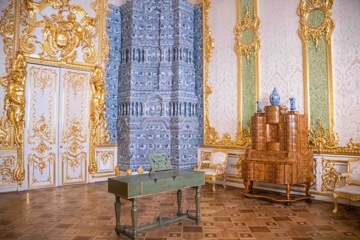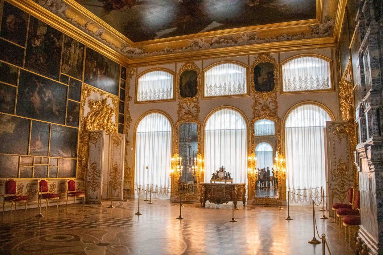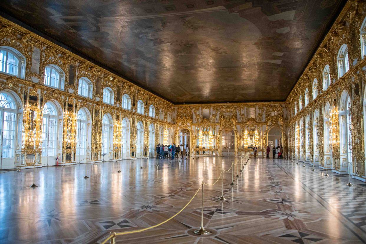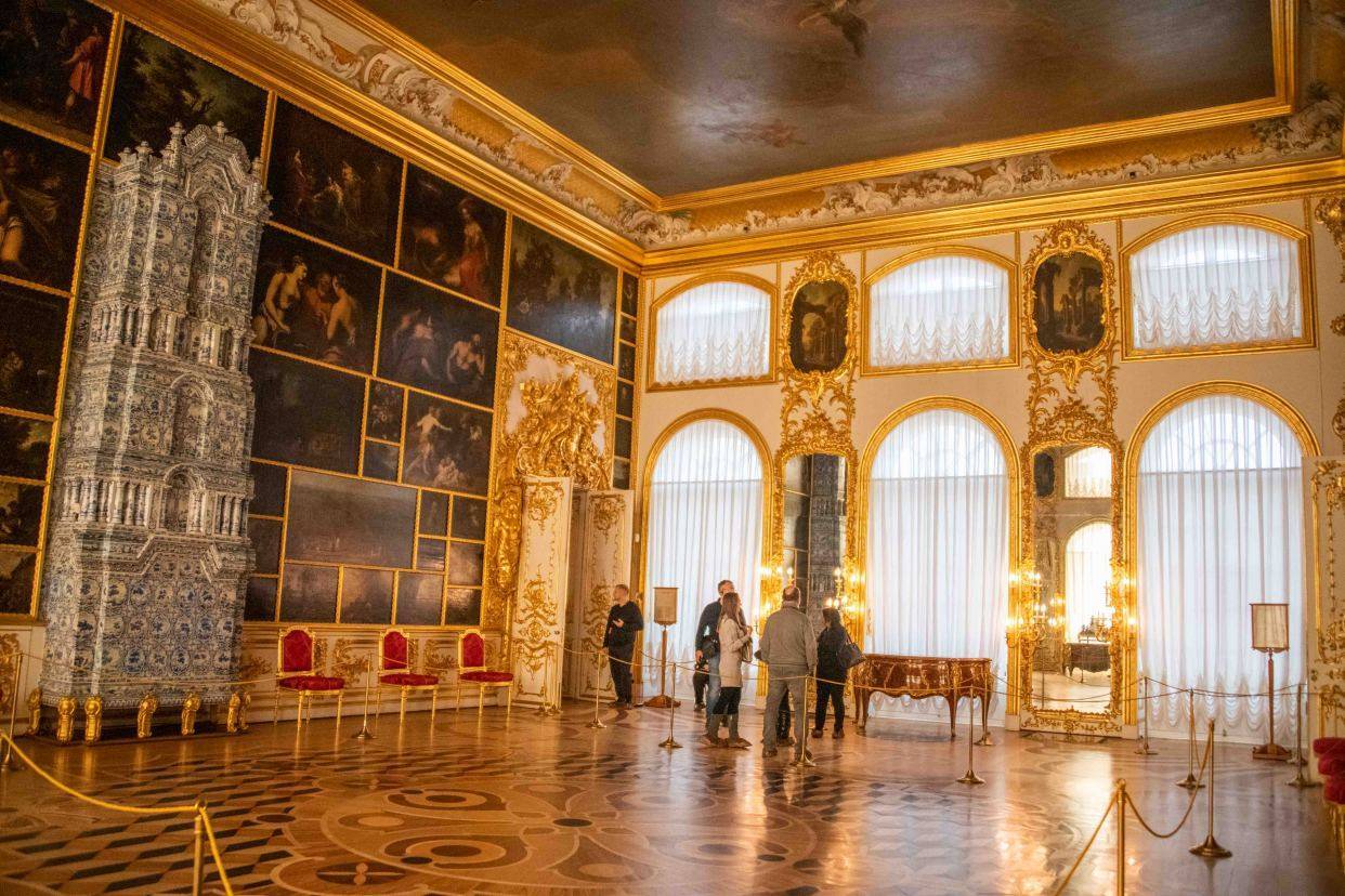 走进宫殿内,便会被耀眼夺目的黄金装饰物、精美的俄罗斯风格花纹及绚丽多彩的油画吸引住目光。叶卡捷琳娜宫共有两层,这里的每个房间以黄金珠宝来点缀,并陈列着设计精巧的家具,的确是富丽堂皇,极尽奢华。宏伟壮观的接待厅和华丽的餐厅以及挂满油画的油画厅等连在一起,形成了一条华丽的“黄金走廊”。穿梭其中,奢靡之感扑面而来。