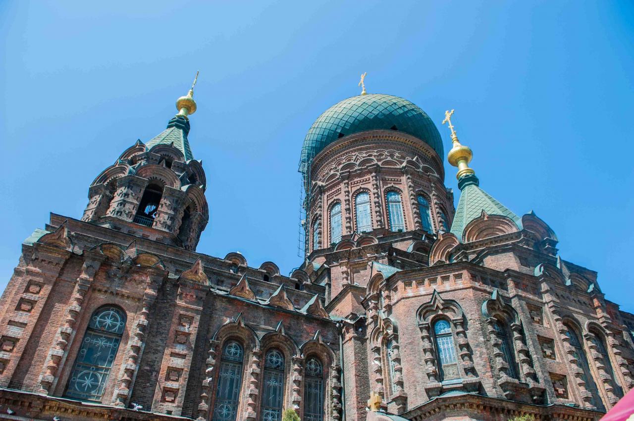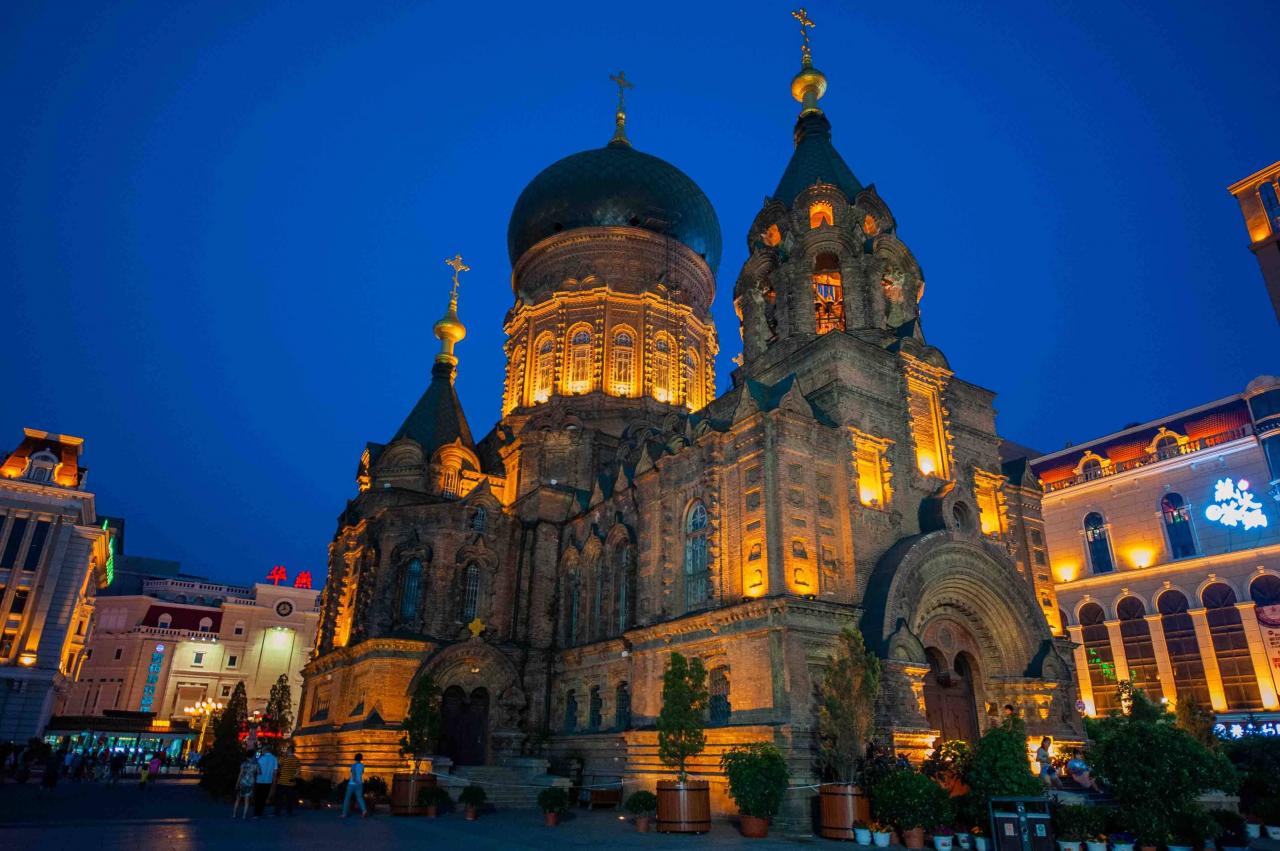 公元1907年,沙俄为了稳定远离家乡的士兵的军心,破土动工建造了圣索菲亚大教堂,由于战乱以及经费等等原因,当年这座教堂还是一座全木结构的教堂。直到1923年,教堂举行了第二次重建奠基典礼,经过了长达9年的精心施工,一座富丽堂皇的建筑精品竣工,摇身一变为成为了一座清水红砖,绿色圆顶的拜占庭式建筑。经过了历史的洗雨和人们不断地修复,圣索菲亚大教堂作为一个艺术建筑博物馆,已经成为哈尔滨一处独特的景观。全国热播的电视剧《夜幕下的哈尔滨》里面很多镜头都是在教堂这里取景拍摄的。
