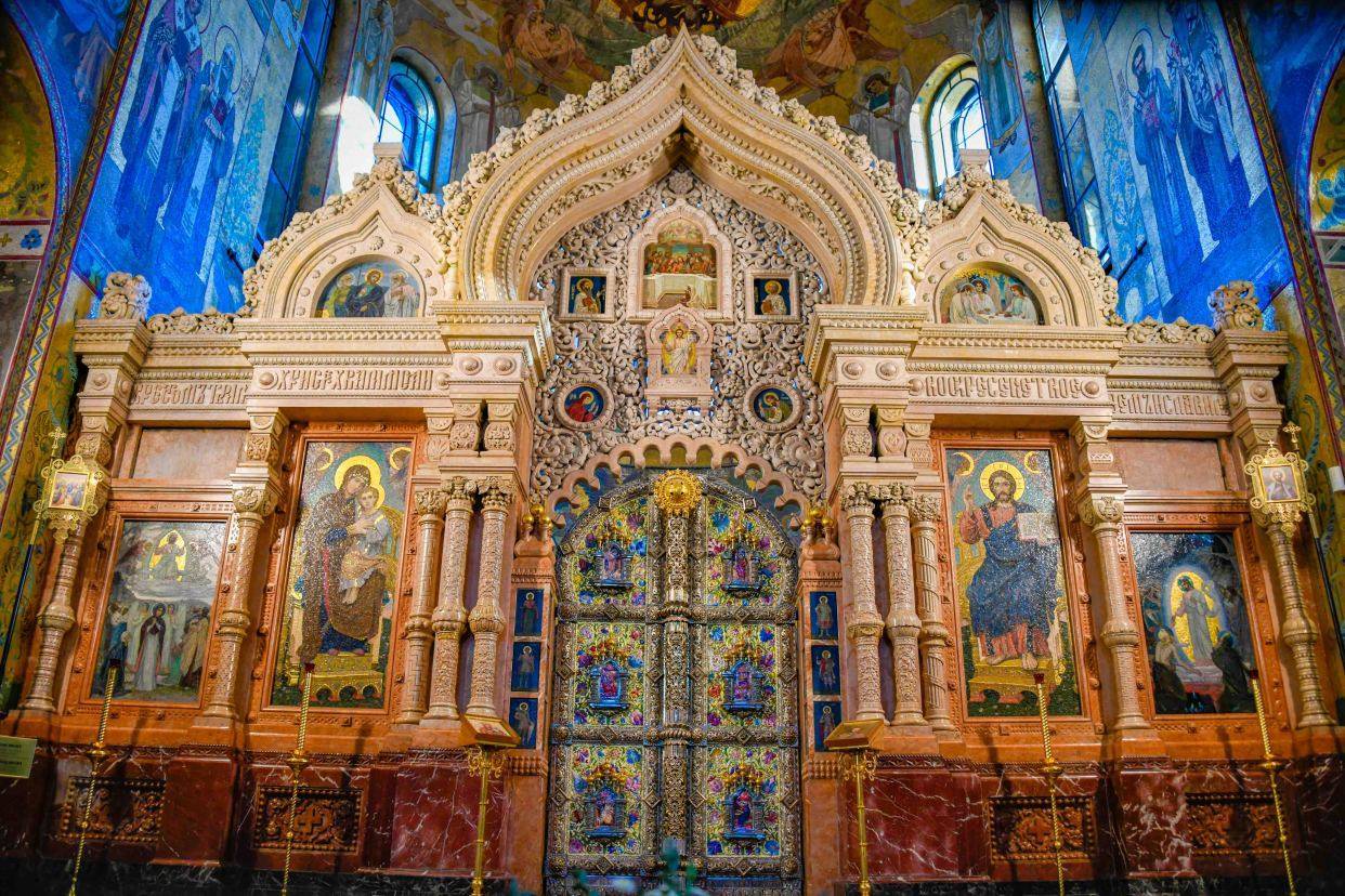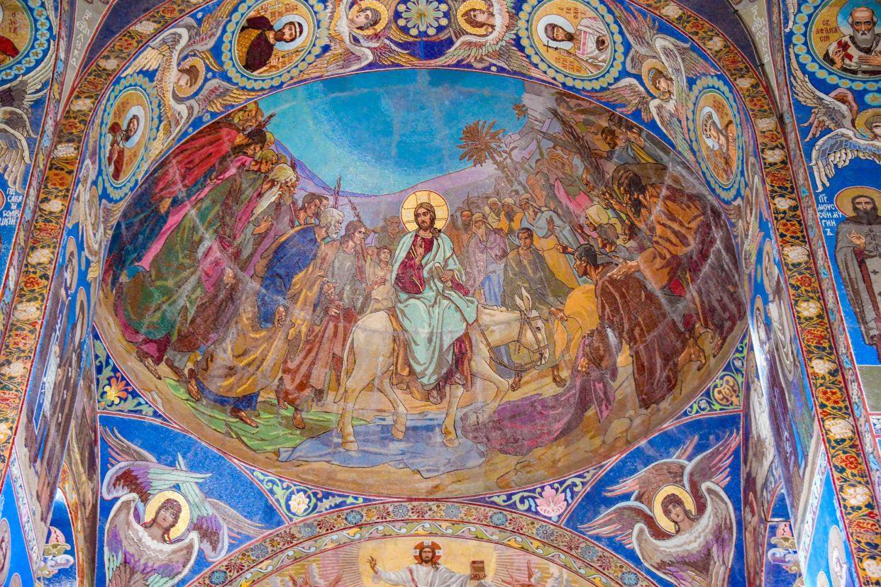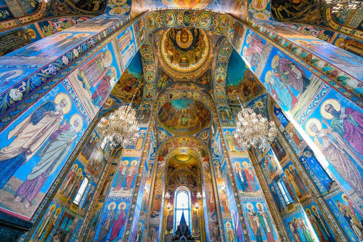 滴血救世主大教堂和俄罗斯其余修筑的欧式大教堂不同,滴血救世主大教堂完全充满了浓郁的中世纪俄国风格,极尽奢华,又无比精致大气。当你走进内部你会看到各种耶稣的形象,穹顶上、壁画上,还有各式宗教题材,整个教堂在吊灯的照射下,金碧辉煌,令人头晕目眩,仿佛深处中世纪,俄罗斯中世纪的皇室故事悄然上演。