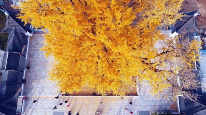 离开中华银杏园,我们前往下一站。银杏古梅园,它在沂河的另外一面,我们需要通过大桥之后到达。来到这里,最大的看点就是去看一棵老神树。银杏古梅园的这棵老神树,树高41.9米,树围8.2米,根系的占地面积达到了100余亩,是亚洲最大的银杏雄树。据考证,这棵树是郯国君郯子所种下来的,距今已经有3000多年的历史了。老神树是雌雄同株,其中雄树可以为方圆二三十公里范围内的银杏雌树授粉。这里的门票是35元一个人,银杏古梅园游玩好,我们就要从郯城县自驾进入徐州邳州市范围是欣赏银杏的美景了。