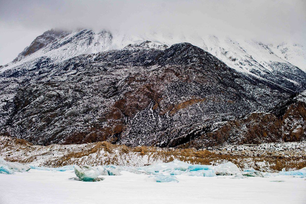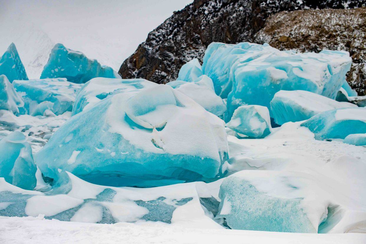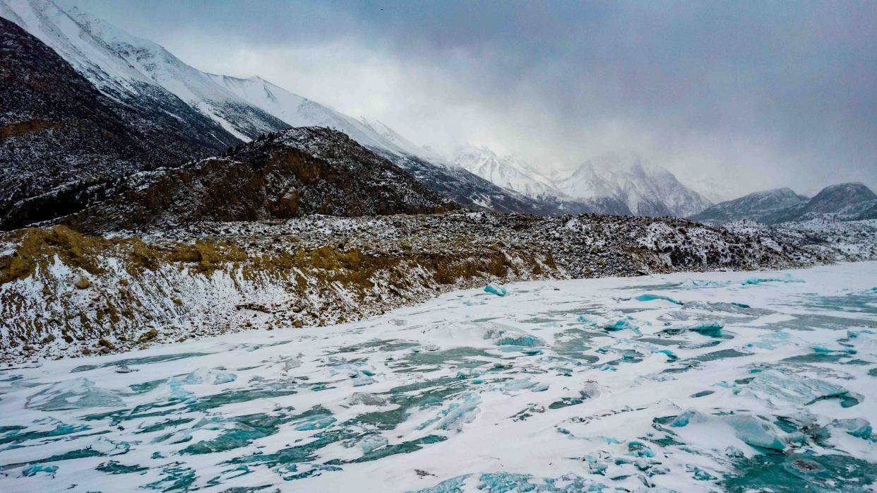 我们站在来古村附近,便可以看到整个雅隆冰川,从头到尾,可以完整地看清大自然的鬼斧神工。而且雅隆冰川深入贡措湖中的巨大冰舌,浩荡宏伟的气势挡也挡不住啊。大家都被震撼到了,让无人机飞到空中咔嚓咔嚓一顿拍摄。此时正值冬季,来古冰川四处早已结冰在大家身边有一些冰川上掉落下来的冰渣或冰块,这些冰块是蓝色的,晶莹剔透,实在是太美丽了。
