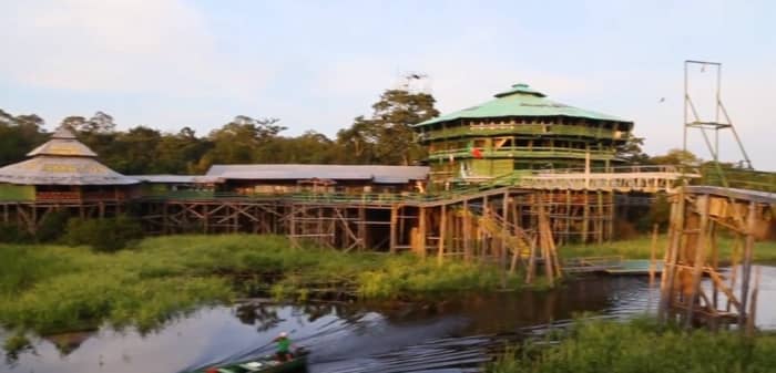 别问我为什么,因为便宜。这里会说英语也没有用,因为他们说葡萄牙语,不过有中文导游,一路上我感觉就像一条大河上长了很多的树,陆地很少,大概40分钟左右的样子就到了酒店,据说这是世界上最大的树屋酒店,整个酒店都建立在水上,满酒店都是猴子。