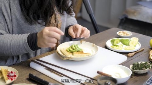 在摆放时,遵循体积从大到小、从下到上的原则;首先面包作为主体先放在盘子中,其次放入蛋黄酱,可加入黑胡椒让质感更丰富,在摆放时用相机的视角去观察拍摄物;