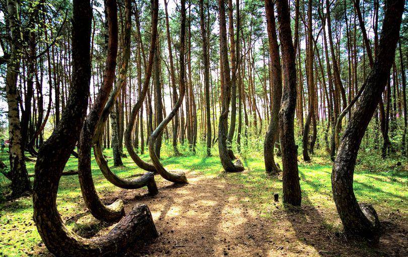 远远望去,这片树林很是壮观,高大耸立的松树郁郁葱葱,生机勃勃。令人感到不可思议的却是这些松树并不像普通的树木那样,垂直于地面向上而生。这里的每一棵松树都先是贴着地面长出了一段,然而再向上生长,与地面形成了90度的弯曲角,就好像是跪着一般。正因此人们才将这片树林称作是弯曲森林。更惊人的是它们跪着的方向是一致的,都是向北弯曲,这就让人费解了,为什么好好的松树不向上生长,而是要跪着呢?
