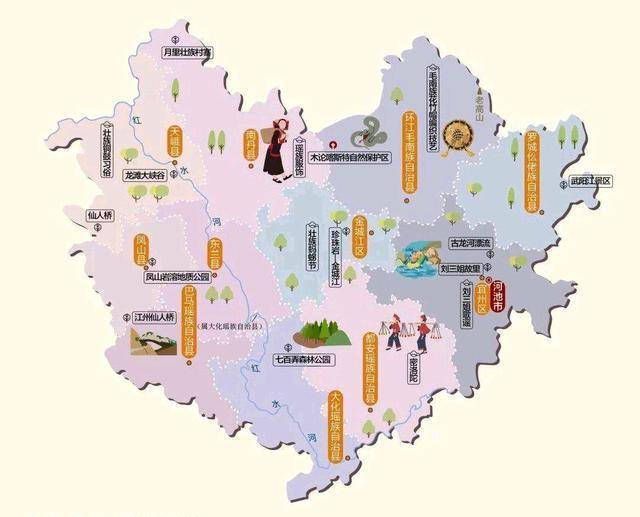 河池,位于广西北部,南与南宁相连,东与柳州为邻,北与贵州接壤,西与百色毗邻,面积约3.35万平方千米,辖2区(金城江、宜州)、9县(巴马、大化、罗城、都安、环江、南丹、天峨、凤山、东兰)。